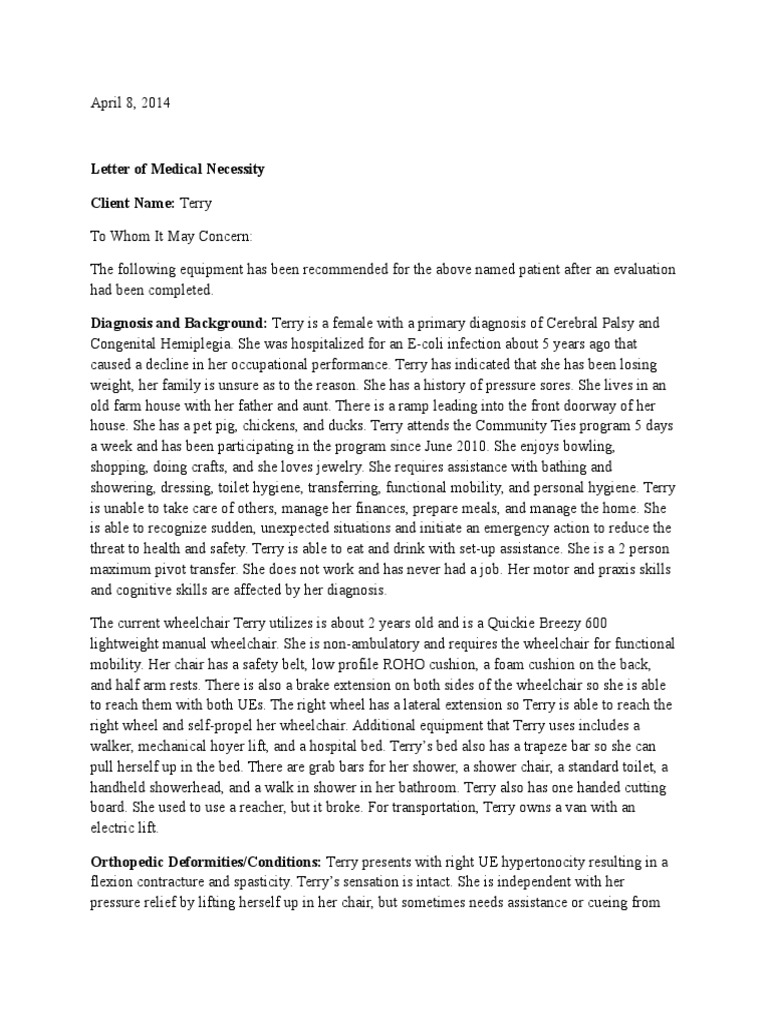 How to write a letter of medical necessity for a wheelchair. It suggests that youve established a relationship with the client and the equipment youre. These design templates provide exceptional instances of exactly how to structure such a letter and also include example content to work as a guide to format. Answer We need to document the evaluation of the clients systems including both neurologic and orthopedic their postural assessment and their level of function.